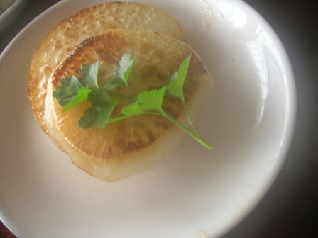 聖護院大根を輪切りにして皮をむいて、ごま油でフライパンで焼いただけです。それにイタリアンパセリを載せて醤油をかけて食べます。