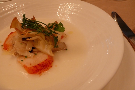 上から、コリアンダー、きのこ、オマール海老で、周りの白いソースの中に大根が入っているらしいです。
